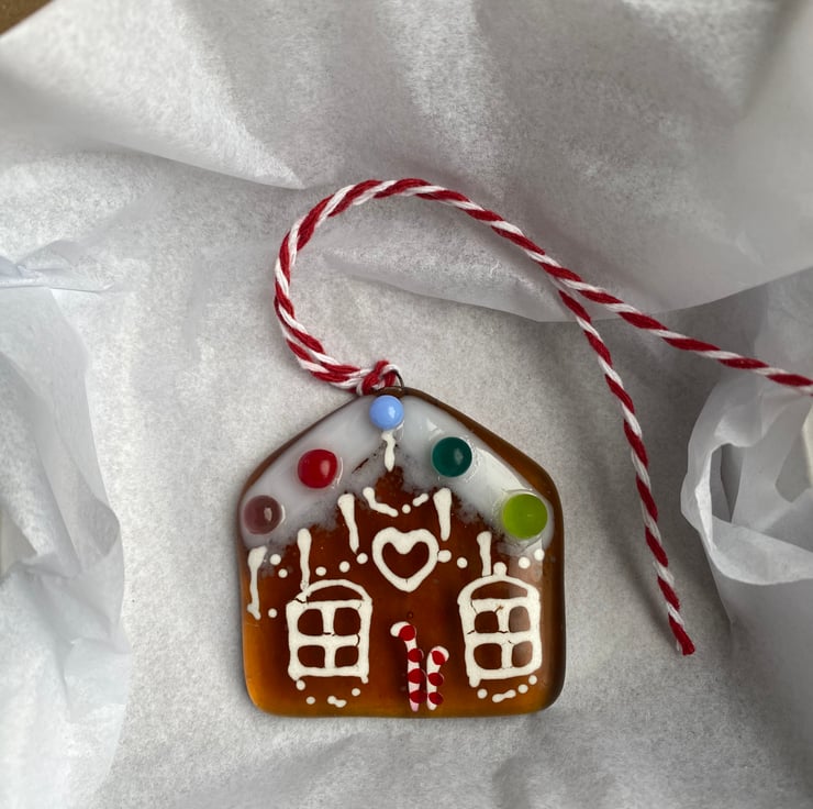 This delightful gingerbread cookie house measures 5cm and featured a fused glass candy roof and painted candy canes. Hung from a small metal hook with candy cane twine and presented in a tissue paper lined box.