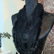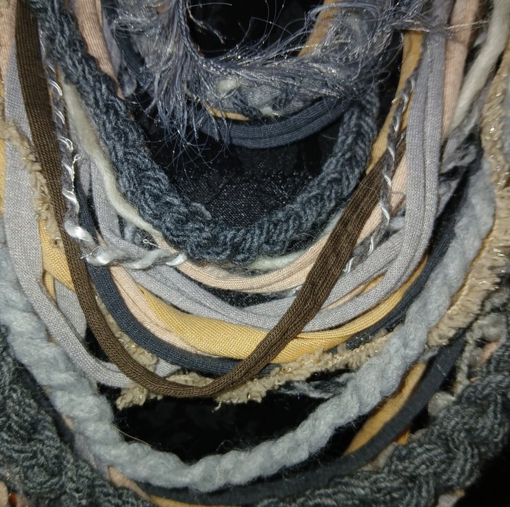 A handmade loop scarf/necklace that is easy to wear (just pop it over your head) but makes a real statement. It is made out of unwanted, unloved and repurposed materials, making each one unique.