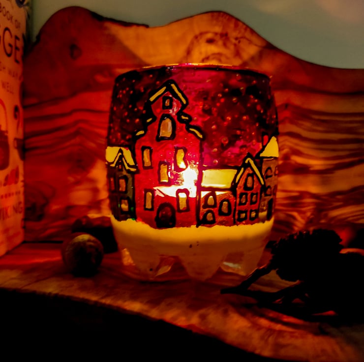 Stained glass effect handmade painted candleholder with Christmas winter town
