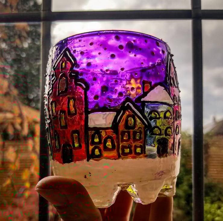 The candle holder is painted on barrel whisky glass with the transparent white, snow covered ground on the bottom followed by a row of colourful, cartoony town houses followed by violet coloured sky/background spotted with gold dotty stars with one central gold-lined eight armed star. The lantern is covered by layer of transparent varnish for protection.