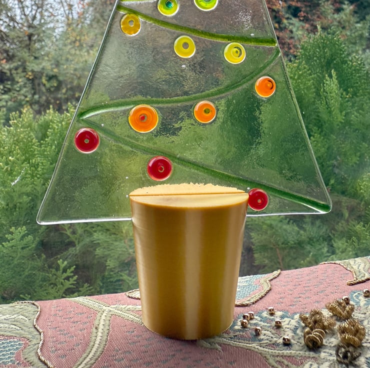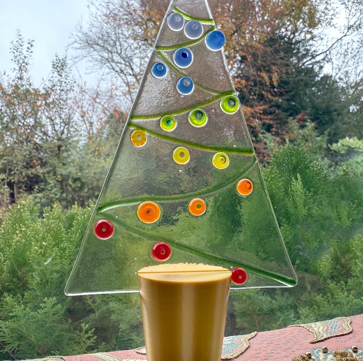 Shown with my own handmade fused glass Christmas tree made with 3mm glass. The tree measures 15cm high and 10cm wide at the base.