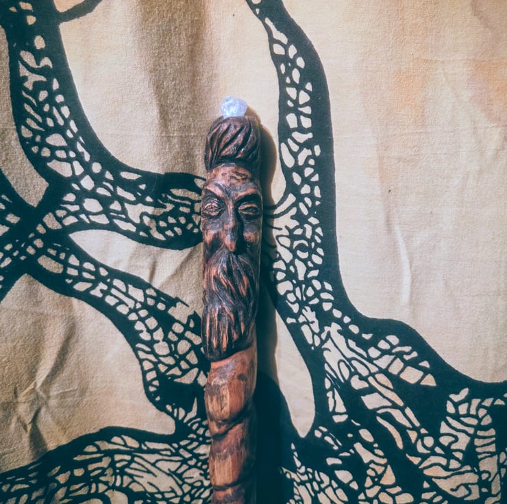 The inspiration came straight from the forest. I found the wood on a walk, drawn by instinct to its natural twist—it felt like a spirit was waiting within to be released. My carving process was guided purely by intuition and spiritual belief, allowing the hidden face to slowly emerge. The final piece represents courage, strength, and the power of transformation, with the crystal channeling powerful grounding energy.