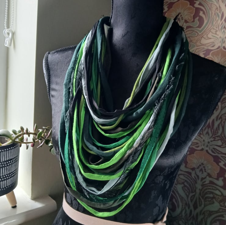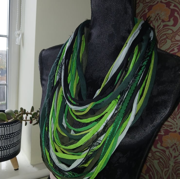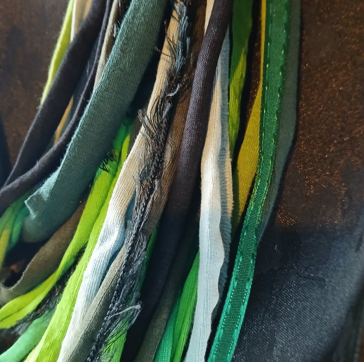 I read a book calles The Green Witch, and was inspired to start my business making scarves out of unwanted, unloved and repurposed materials. The message od the book, fir me, was abiut livibg in harmony with nature and having respect dor nature, so this scarf was inspired by The Green Witch.