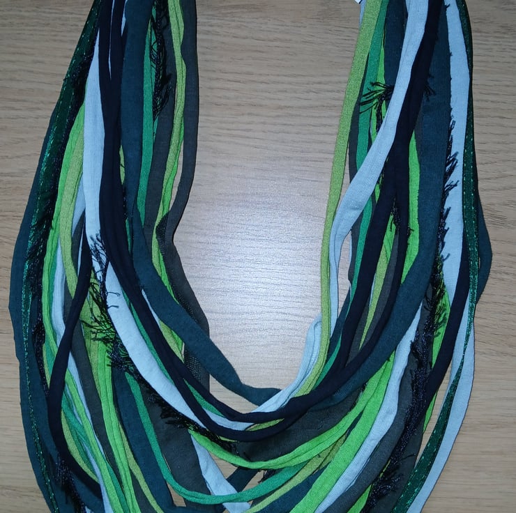 A simple design, this handmade infinity scarf is easy to wear and makes an effortless statement. It has been made out of unwanted, unloved and repurposed materials. I love making beautiful scarves out of old t-shirts and yarn oddments, that would otherwise have ended up as landfill.