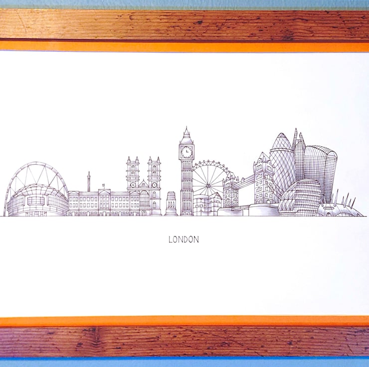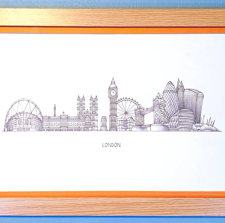 Framed high-quality shaded A3(42cm x 30cm) landscape Giclee print of a London Cityscape/Skyline. The original artwork was created from scratch, firstly by sketching out in pencel each building. After outlining the pencil work using different thicknesses of Faber-Castell and Staedtler black pigment liners each building was then shaded using the Winson and Newton promarker grey/neutral tone set. The print comes finished with a thin stylish orange border(see shop page for all other border colours). Timber framed with an expensive Styrene Protective Perspex (which has same clarity of glass) ready to hang. Buyer can choose from three types of frame; Black, Oak or Dark Oak. Shades/tones of print may differ slightly due to computer/phone settings. All purchases delivered within 7-10 working days.