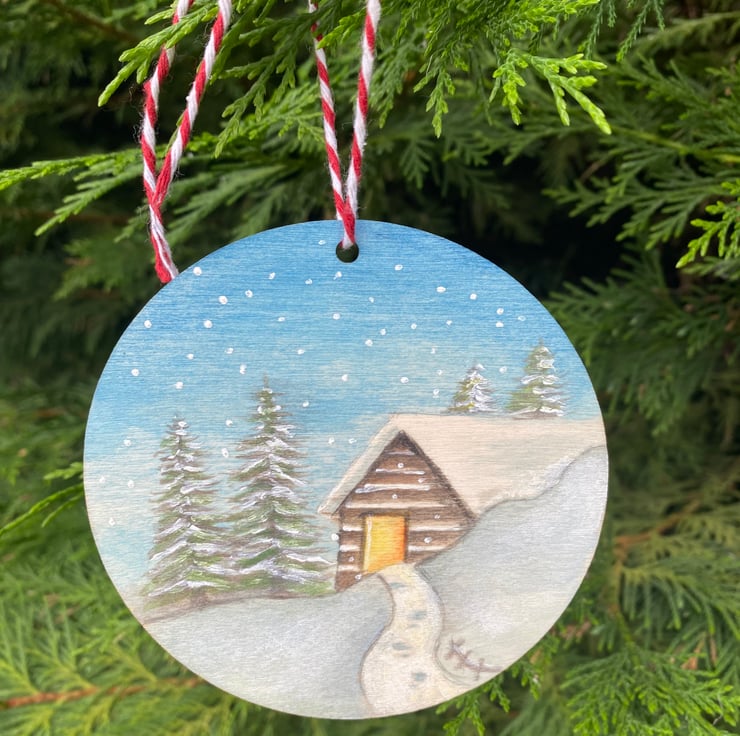 Hand painted Christmas ornament with scenic wintry setting and frosty magic in the air for a sentimental feeling of home