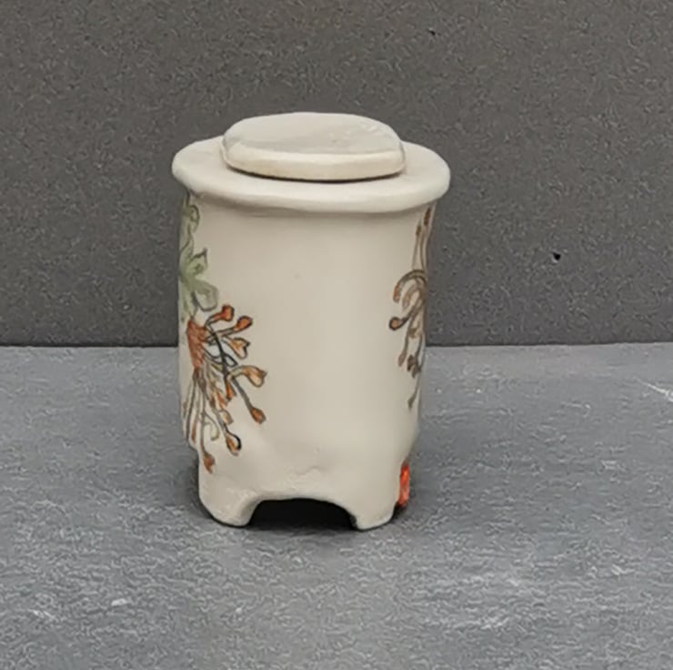 Stoneware keepsake pot with hand-painted design by Kathleen Hepworth