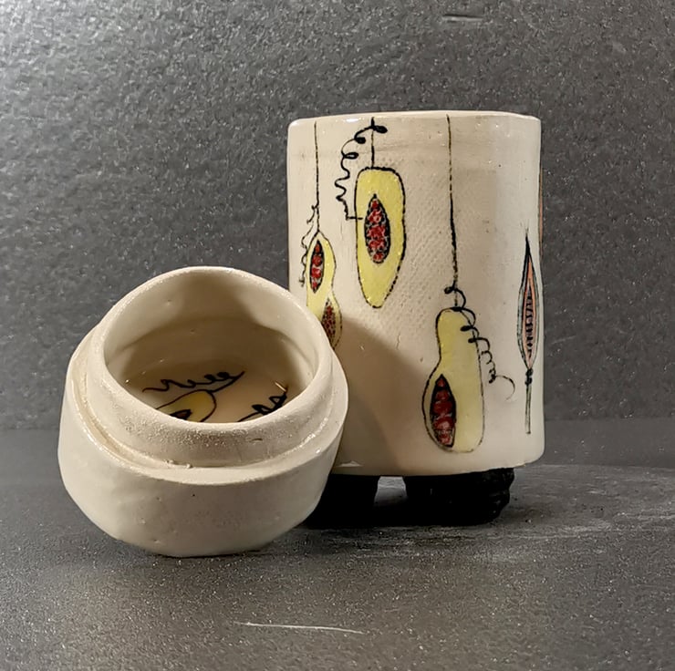 Stoneware glazed lidded jar with hand-painted design by Kathleen Hepworth