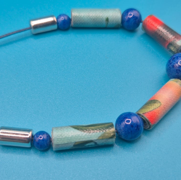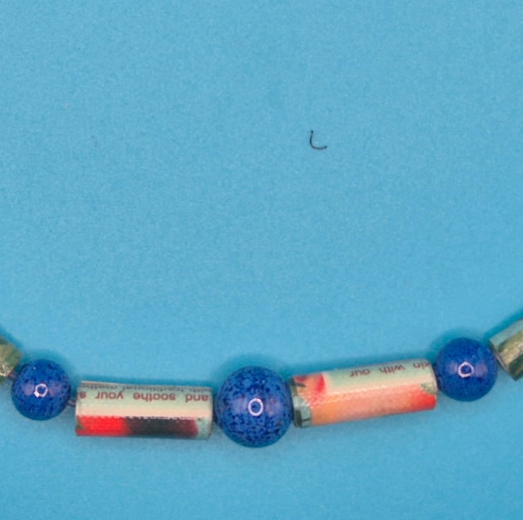 A one of a kind necklace made of paper beads, handrolled from a soap wrapper. The paper had a colourful blue and red flowery design and there was enough to make four long tubular beads. When threaded on a leather thread with preloved dark blue glass beads and metal spacers, the result was an elegantly simple necklace. It is 22.5 cm in drop from the small magnetic clasp to the central blue bead.