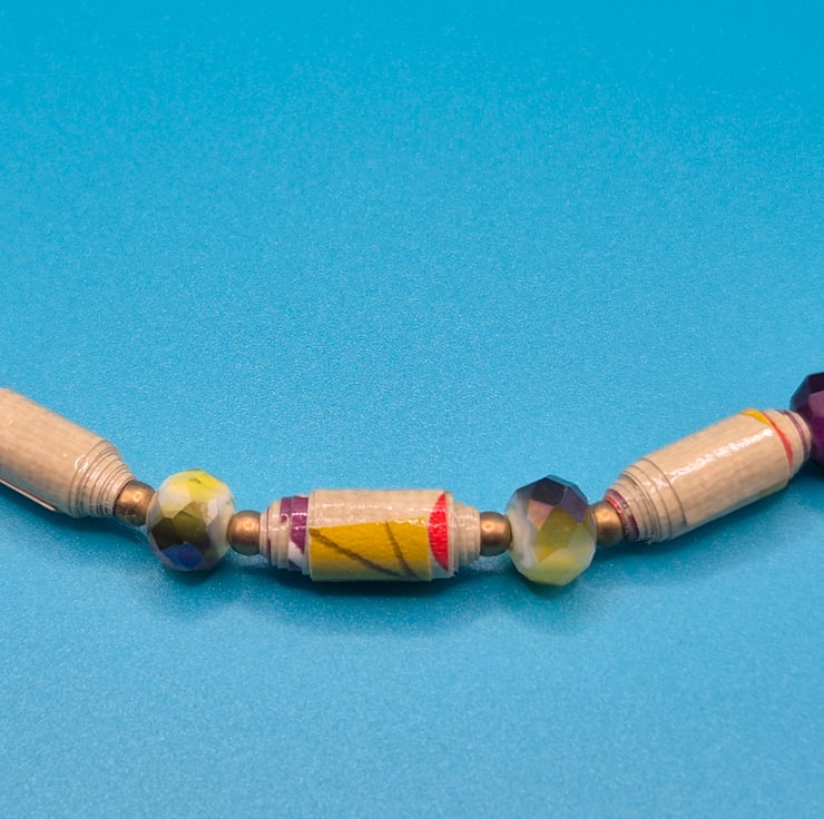 I have used multicoloured unwanted wall paper to make this necklace and choose different types of preloved beads with the same accents of colour to complement the paper.