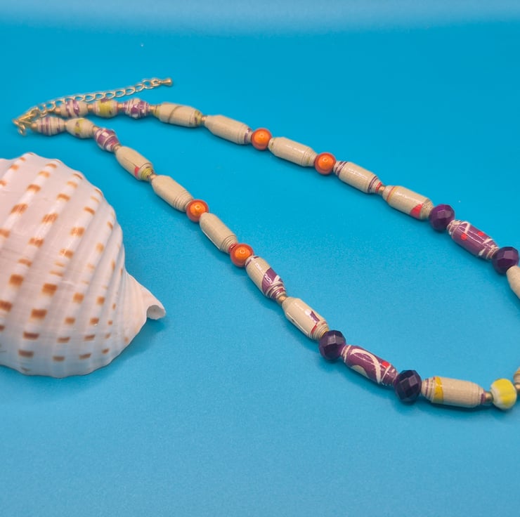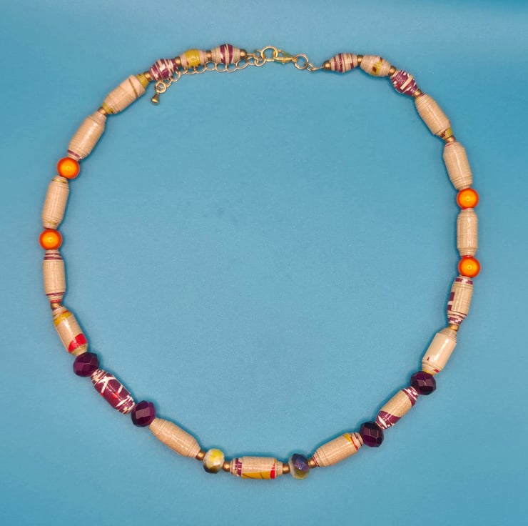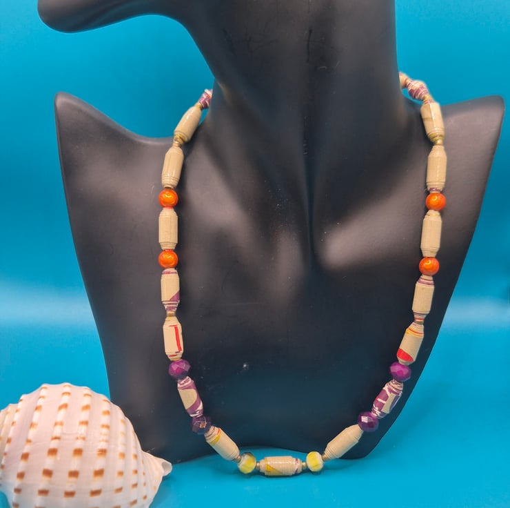 I use recycled paper and I get inspiration from the colour of the paper and whichever pre-loved beads I could find to complement my design - This means that no two pieces are alike.
