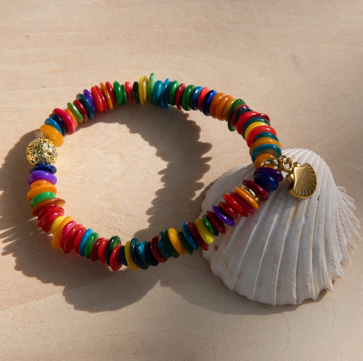 This bracelet is inspired by the Mayan goddess Ix Chel, revered as the goddess of the moon, healing, and creativity. Ix Chel embodies both strength and gentle nurturing energy, symbolising renewal and feminine power. The combination of luminous shell beads and radiant gold details reflects her connection to water, the moon, and transformation. Wear this piece as a daily reminder of your own inner strength, creativity, and balance—the perfect touch of goddess energy to accompany you throughout your day.