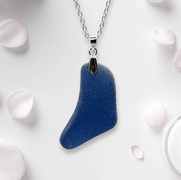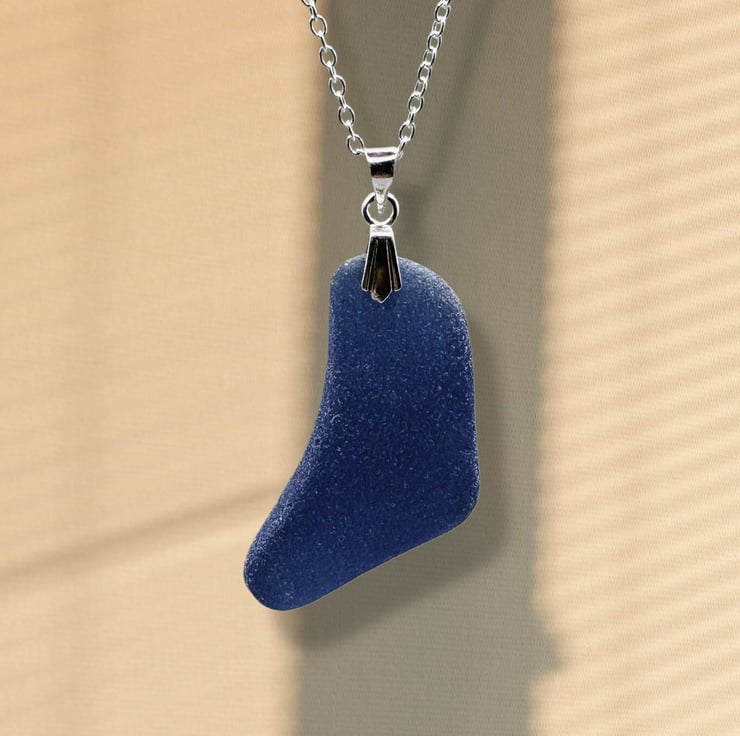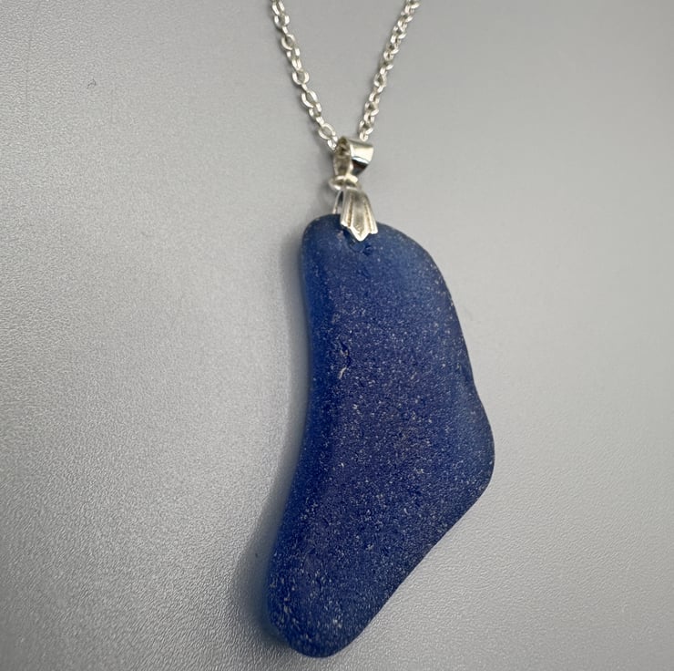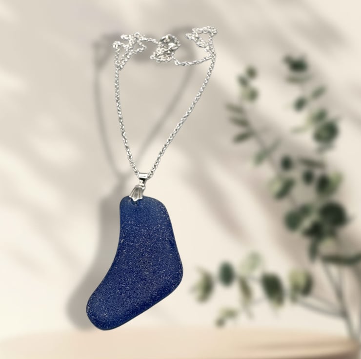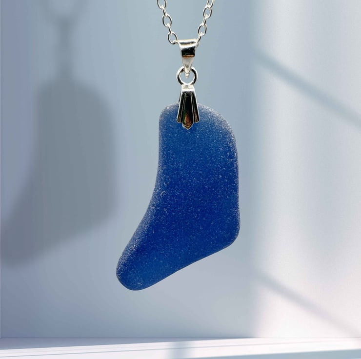 Genuine Kintyre colbalt blue seaglass pendant. Beautiful statement piece of jewellery in a unique shape. Ocean colours of frosted blue with a silver bail. lovely curved shape that is nicely shaped, frosted and smooth after many years rolling in the waves.