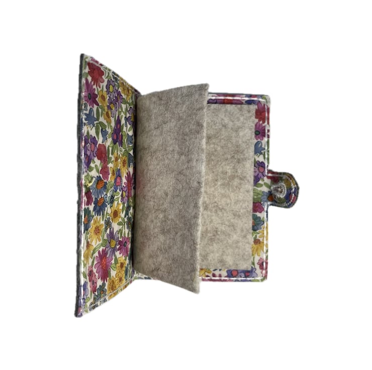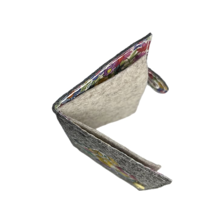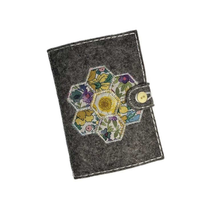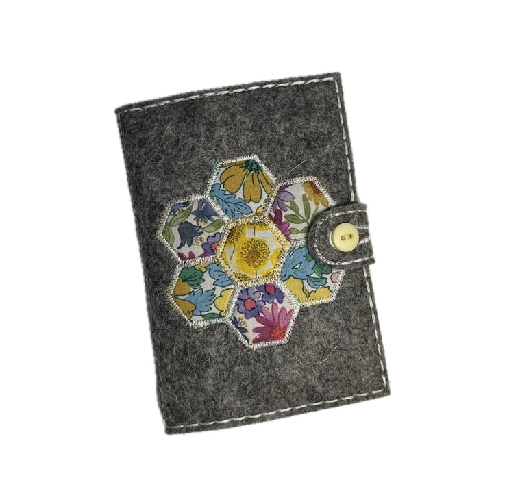 Embroidered needle book made from a mid Grey colour wool felt and embroidered in small hexagons in Liberty Tana Lawn. The lining is a pretty Liberty floral and there are two Oatmeal felt pages to hold your needles.