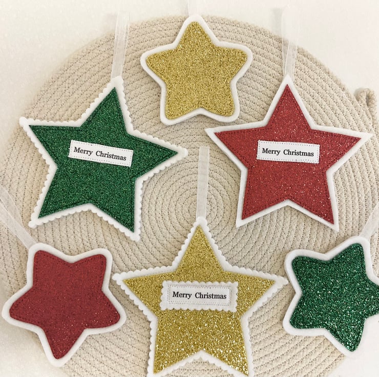 Set of Three Glitter Star Decorations in three colours, red, gold and green glitter on white felt.