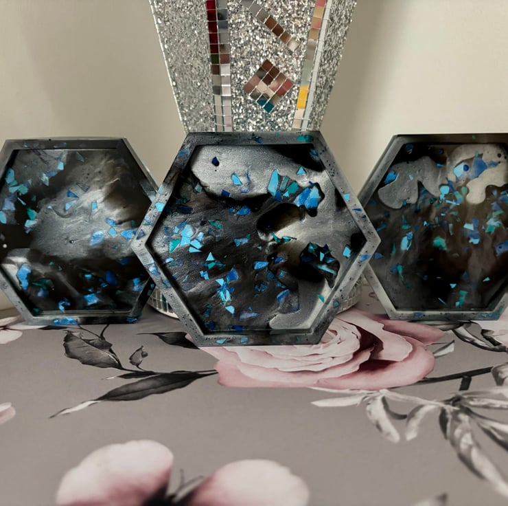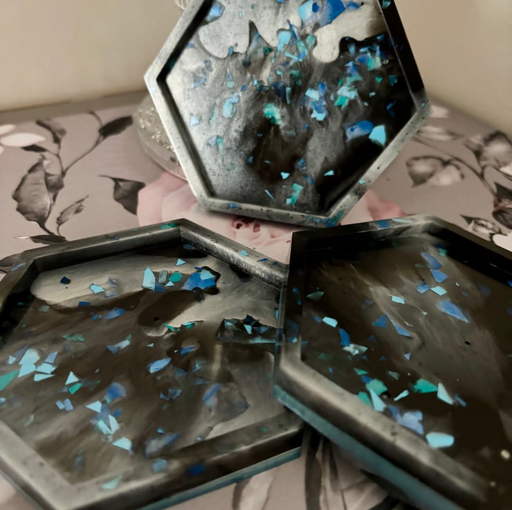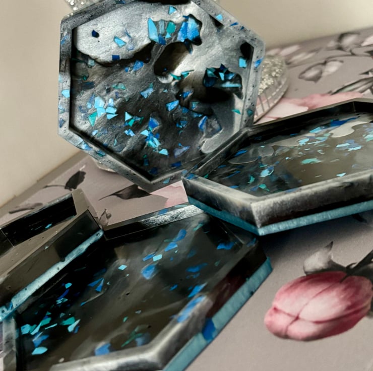 Marble granite effect coasters Fully handmade using resin and a range of acrylic paints in various shades of blue.