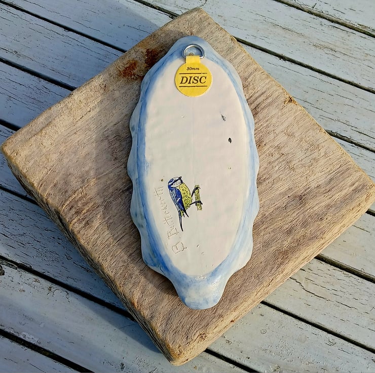 Made in white clay.Drawn and painted with coloured slips and glazed in a transparent glaze.Ceramic decals of birds, flowers and insects are fired on for extra details. Measures approximately 25 cms in length.