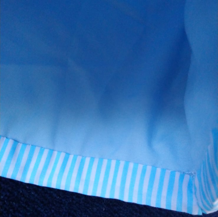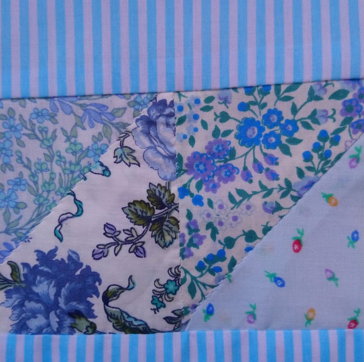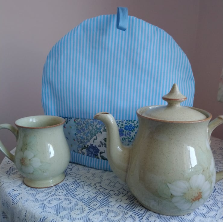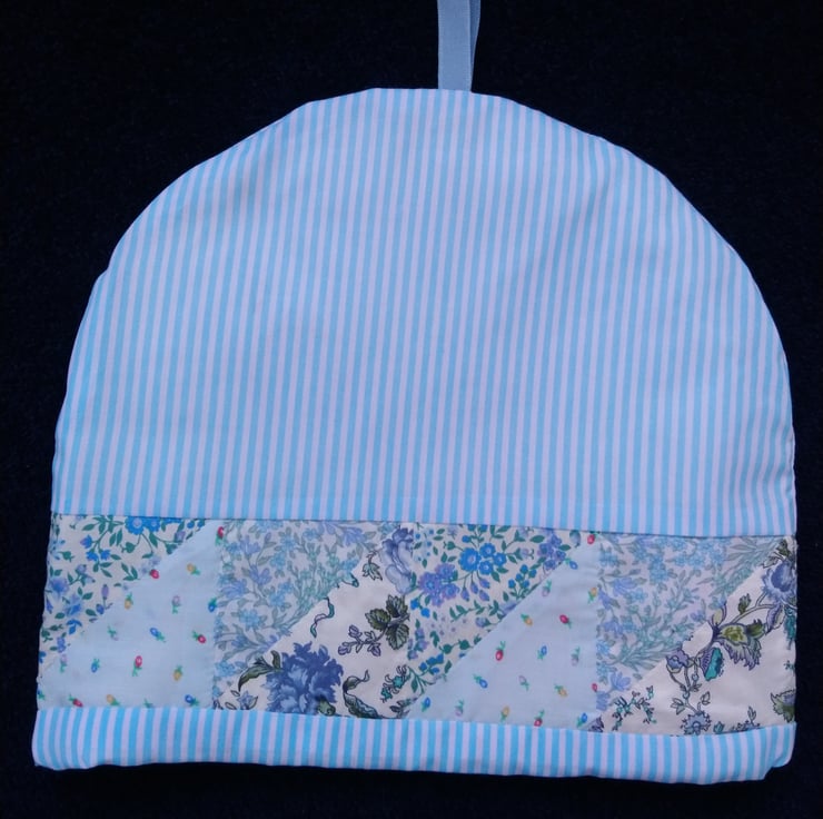 Tea cosy made with a band of handsewn patchwork, using fabrics in shades of blue. The rest of the cosy is in a blue stripe and the lining is in a plain pale blue colour. Between the outer layer and the lining is a layer of wadding, to keep your tea pot nice and warm.
