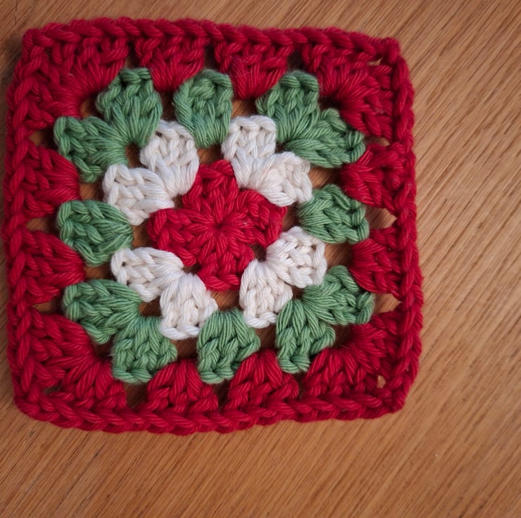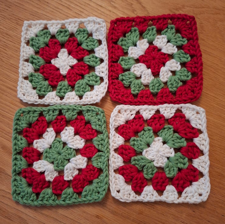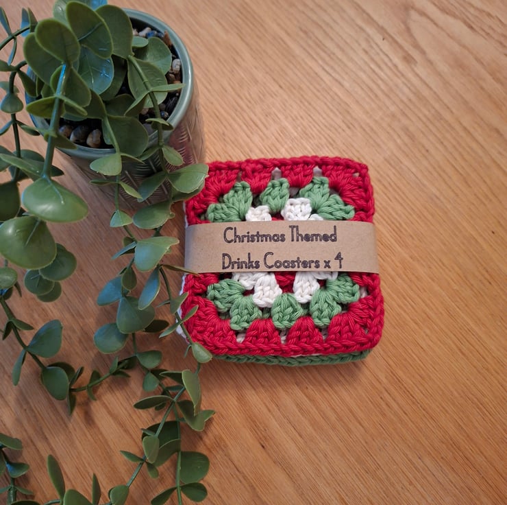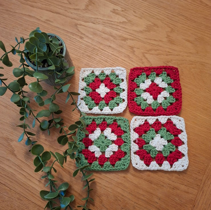 Handmade crochet granny square style drinks coasters for the Christmas season.
