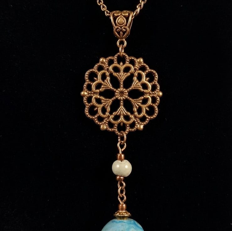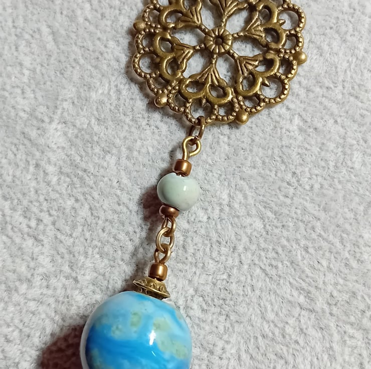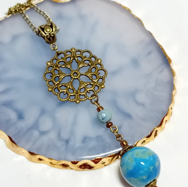 This exquisite Victorian-inspired necklace is a timeless piece of elegance. It features a 12mm handcrafted, high-fired ceramic bead in captivating shades of blue and green. The design is complemented by a 24-inch bronze chain, 3mm wide, offering a classic and durable finish. The pendant is gracefully suspended by a bronze Tibetan bail, leading to a beautifully crafted bronze circular filigree charm, measuring 27 x 27mm. Adding to its charm are two ceramic beads—one 6mm and the other 12mm—dangling delicately below. This necklace comes thoughtfully packaged in a protective organza gift bag, with an option to upgrade to a gift box for a more luxurious presentation.