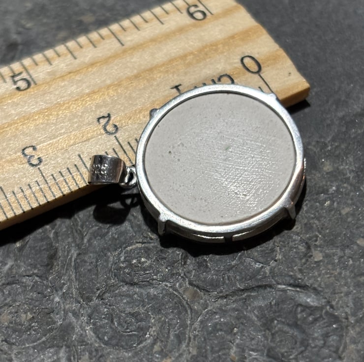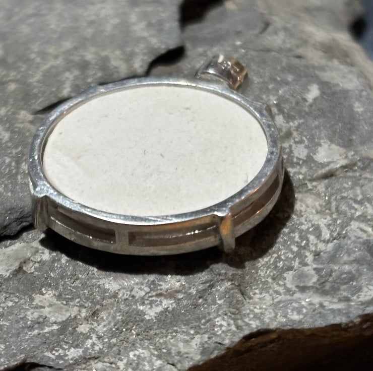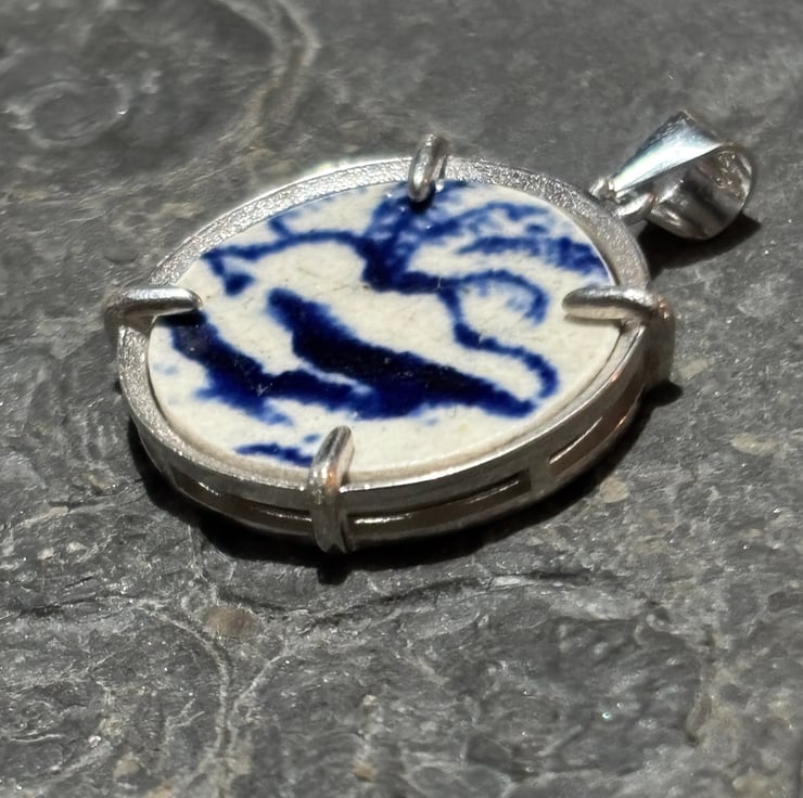 After a thorough clean I stored and came across it while having a clear out. I really love the dark blue so decided to attempt to shape the piece. I managed to sand gently, creating a round pendant. Set into an open back claw bezel, front glaze still in tact, you can still see the bumps in the ceramic.