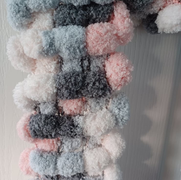 A multicoloured furry scarf that looks like knitted cheesy wotsits! The colours in this scarf are dark grey, light grey, pastel pink, and white. These scarves are beautifully soft, thick, and really long. They will easily wrap around twice at 1m 70 by 12cm wide. There are a variety of colours available to suit any coat colour or personality. These scarves will make an excellent gift or just a lovely addition to your winter wardrobe!