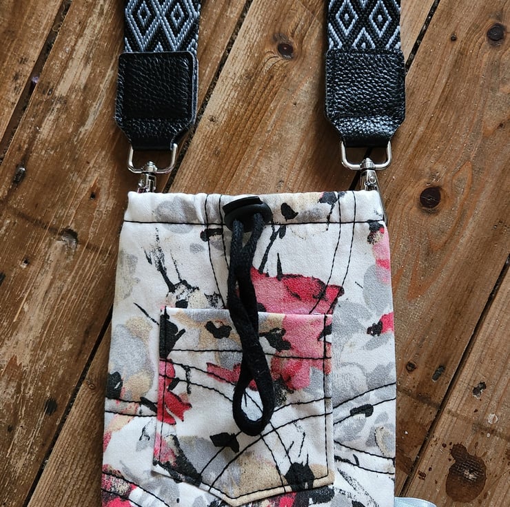 Keep It Cool. Hydration never looked this good. This one-off cross-body cooler bag is made from recycled printed denim, and no two are ever the same. The bold abstract floral print brings instant festival energy, while the drawstring top and front pocket keep things practical.