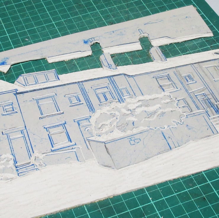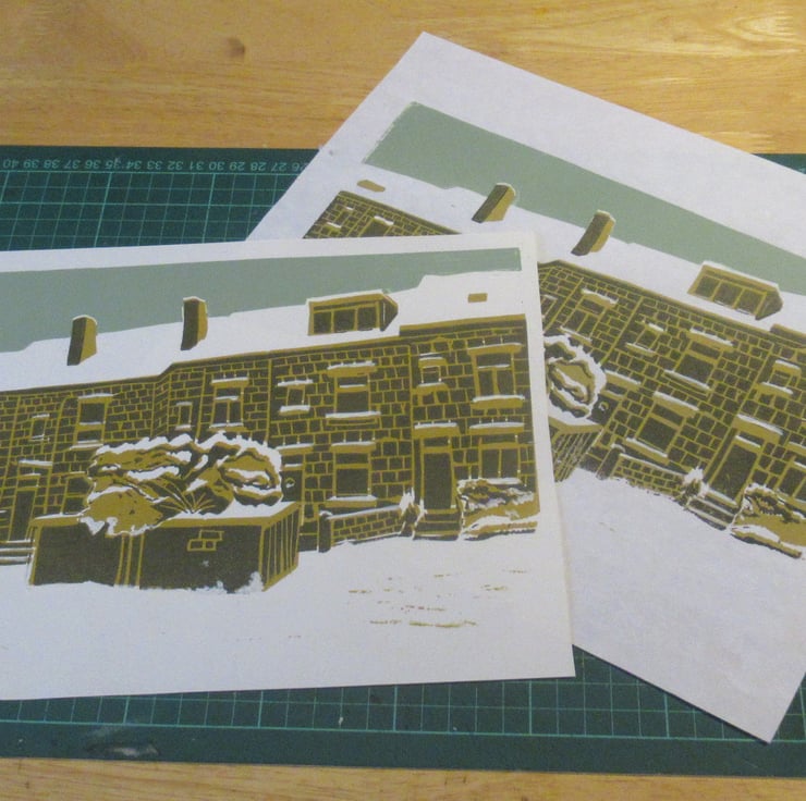 A jigsaw lino print in three colours with the main block reduced to depict the masonry. A small amount of hand-finishing added extra snow in places.