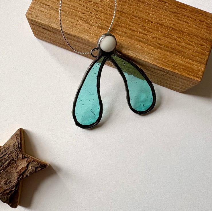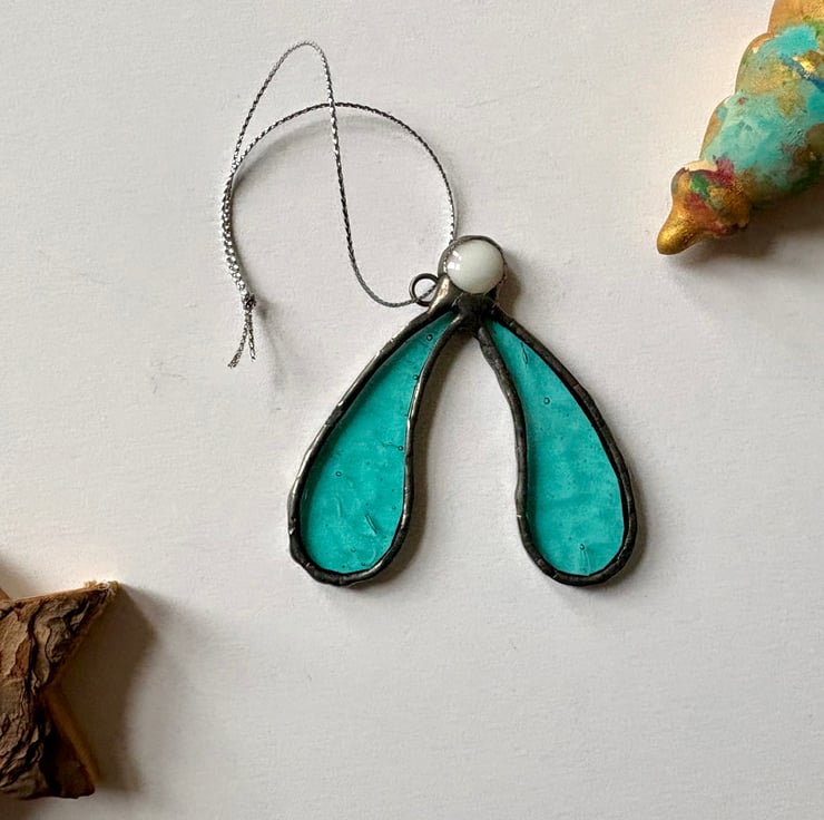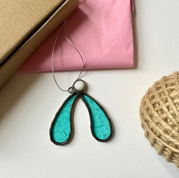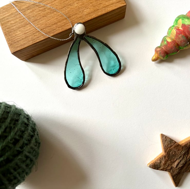 The mistletoe features gorgeous light marine green Luna stained glass and white glass bead. This decoration can made a perfect addition to your festive home decor hang on your Christmas tree or above the door.