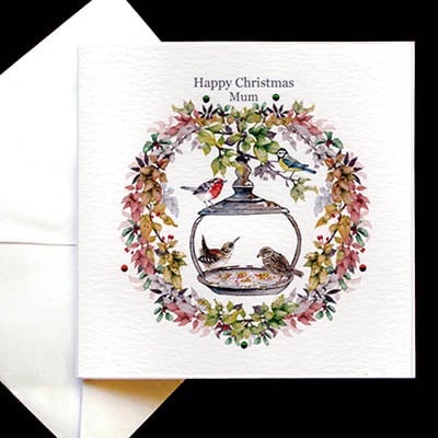 A perfect card for Mum is this wonderful festive hand-painted garland of autumn leaves and berries surround this wintry garden scene. Enjoying a Christmas feast on this special hanging bird table is the cute little wren and the house sparrow, while the bluetit and robin are perched awaiting their turn. On ivory card this beautiful wildlife scene comes to life with silver glitter highlights and a new glass gems to bring that Christmas Sparkle.This card is also available for Mum & Dad or just saying Happy Christmas.