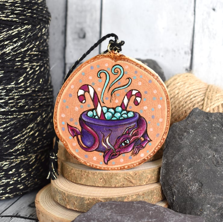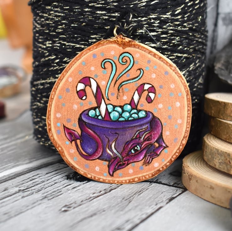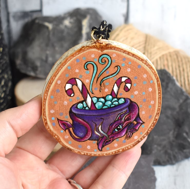 A hand burned pyrography wood slice decoration, with a dragon that loves candy canes!