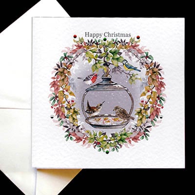 A wonderful festive hand-painted garland of autumn leaves and berries surround this garden scene. Enjoying a Christmas feast on this special hanging bird table is the cute little wren and the house sparrow, while the bluetit and robin are perched awaiting their turn. A grey wintry sky highlights falling snow in the background. On white card this beautiful wildlife scene comes to life with silver glitter highlights and a few glass gems to bring that Christmas Sparkle.
