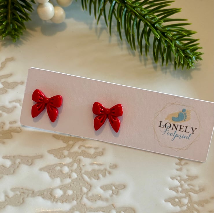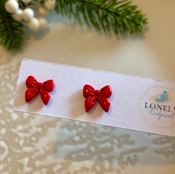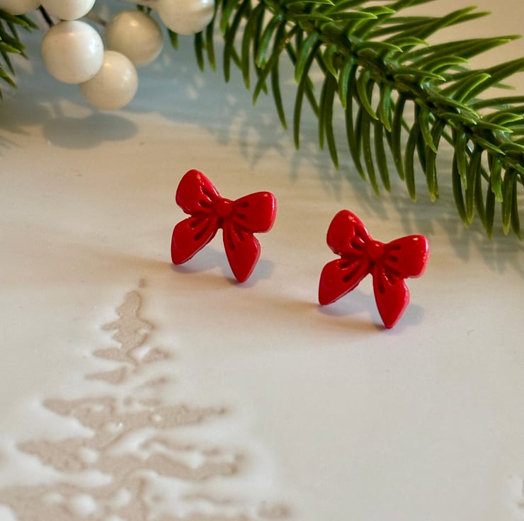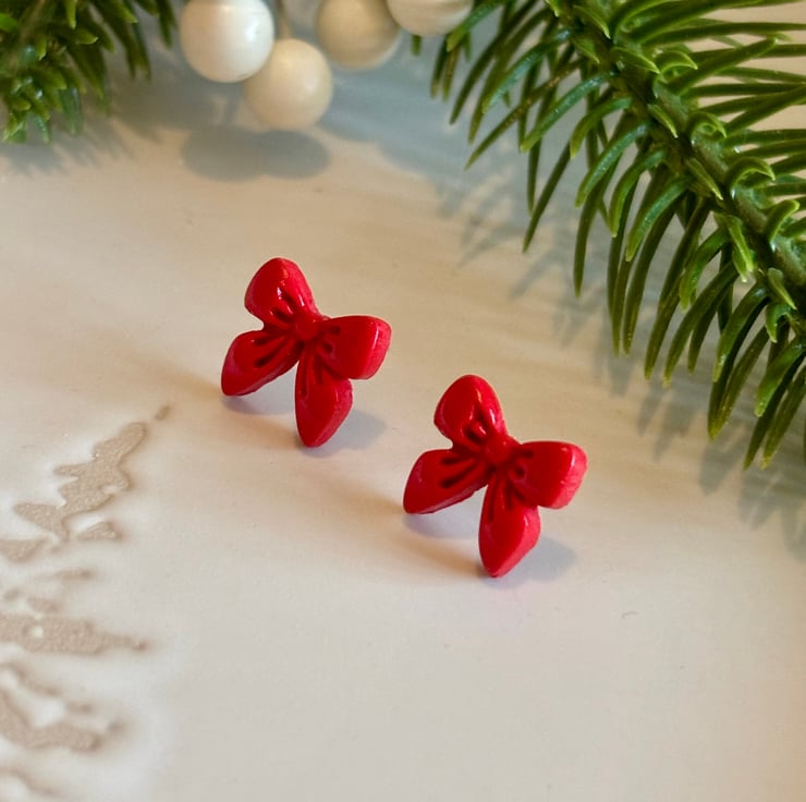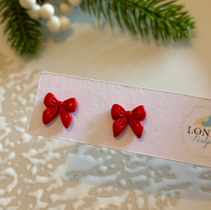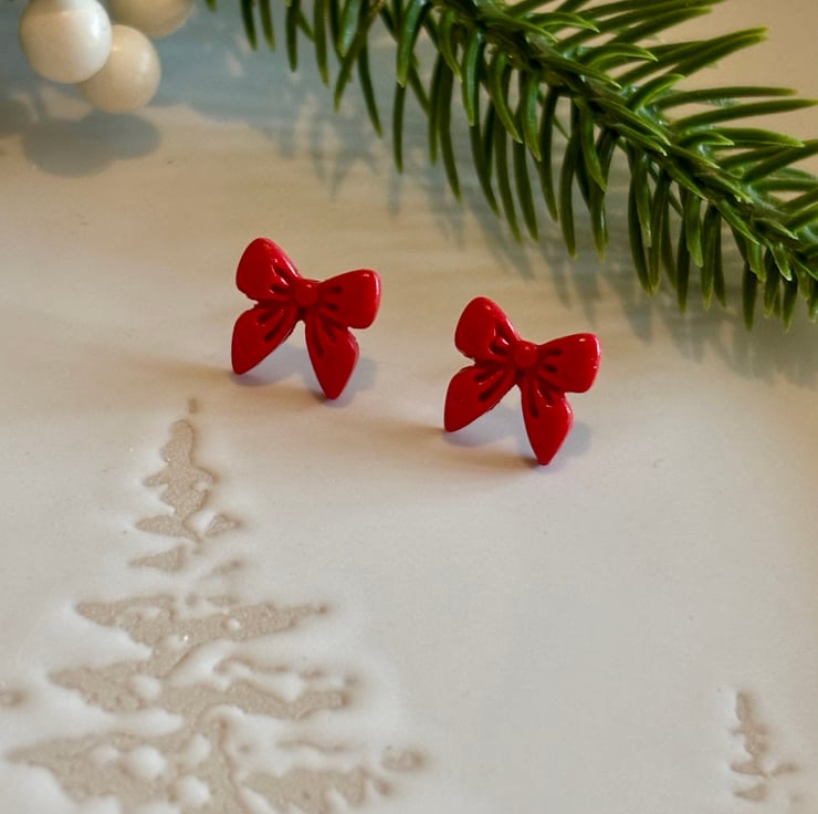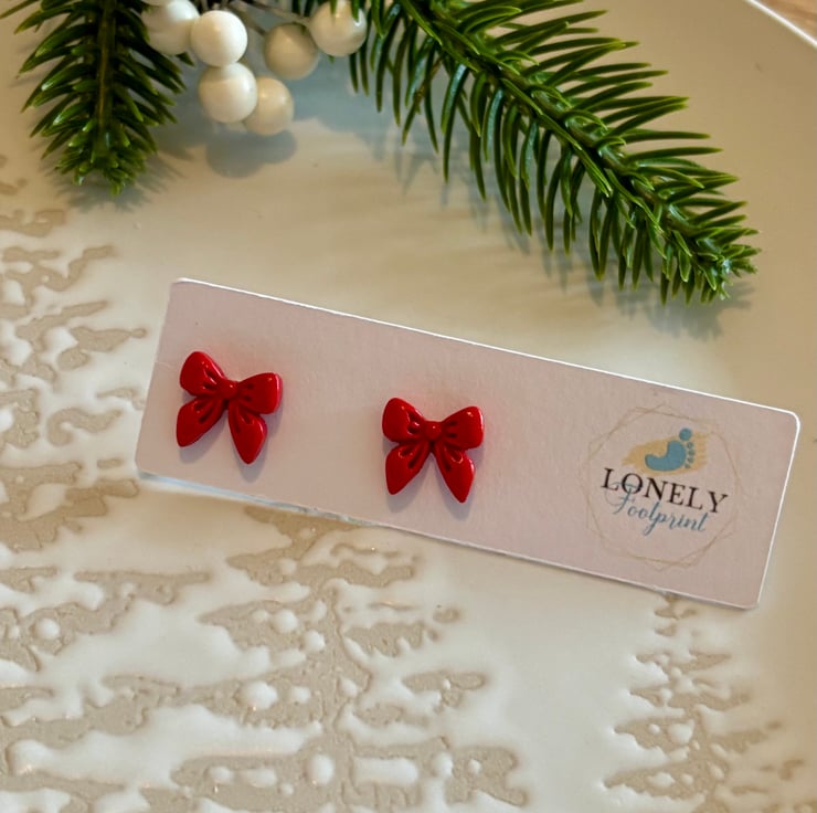 Christmasy red bow studs, bright and super comfy for all day wear. A cute and festive finishing touch to any Christmas outfit.