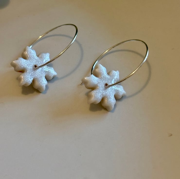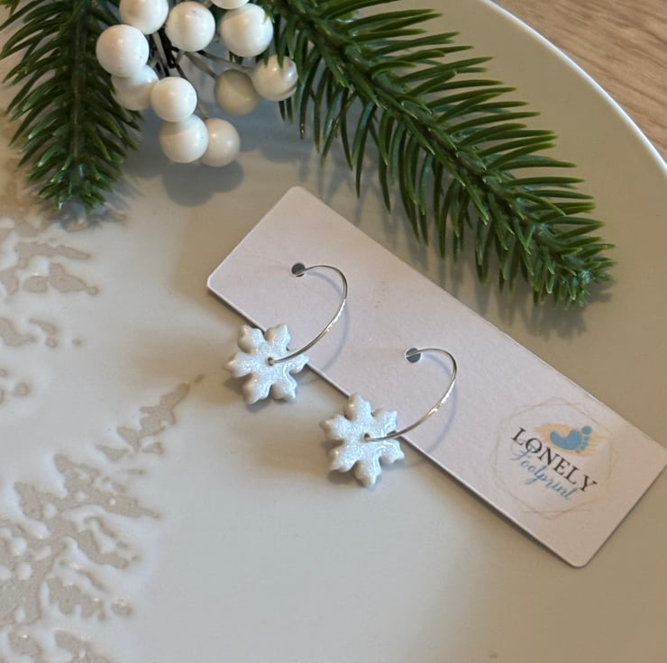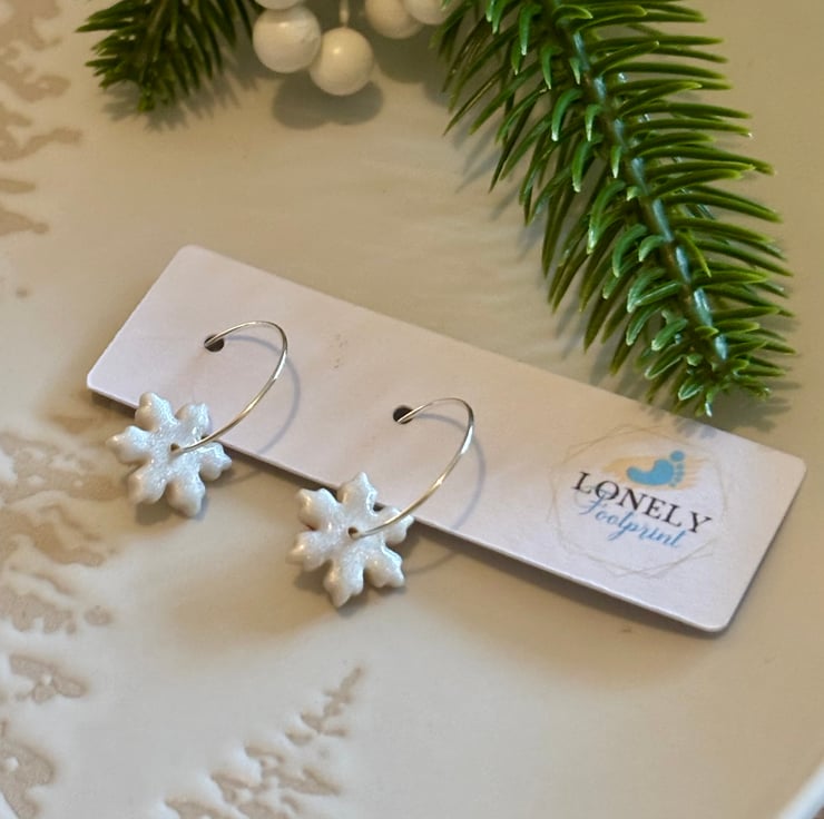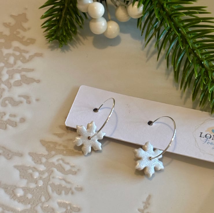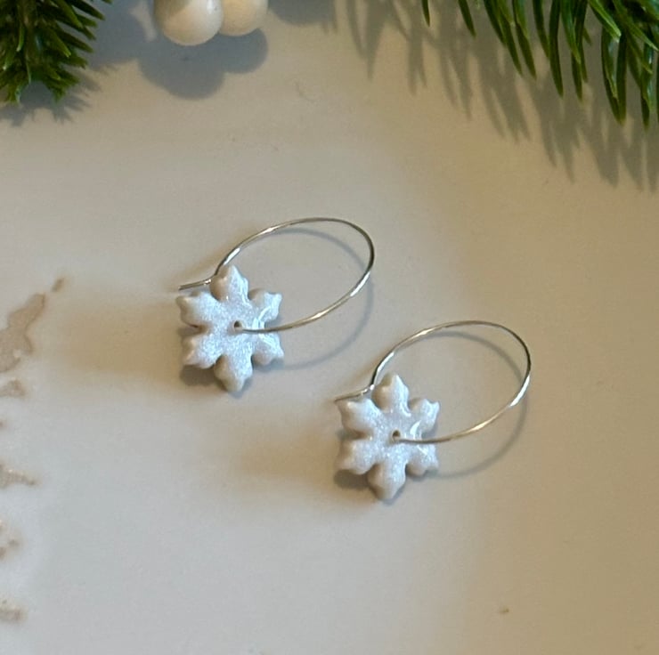 Pearl Snowflake Hoops handmade using Polymer Clay. Perfect for Christmas and Winter.