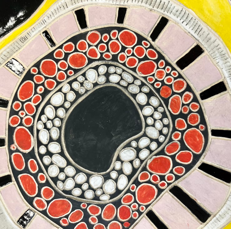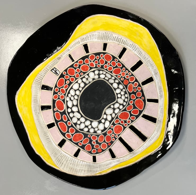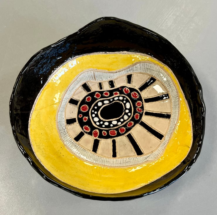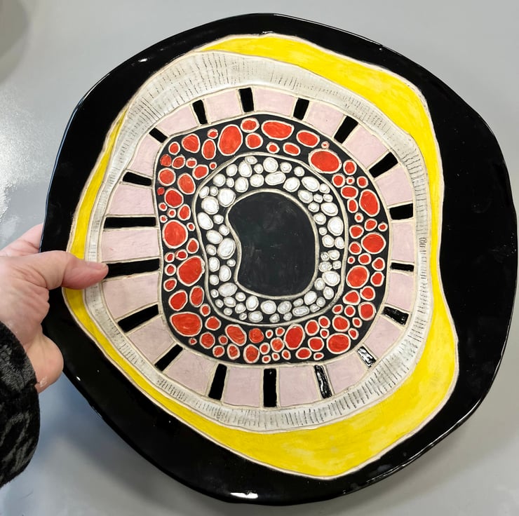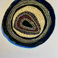 This fabulous piece has turned out so well. It’s so bright and cheerful it will instantly wake up your room! The rim and the black stripes are in gloss glaze and the rest is Matt. It will be wired and ready to hang. It measures 32x32cm approx and is thin and light so suitable for any wall. It’s a unique piece and I won’t be making another however if you look at my bowls you’ll see that there is one which is part of the same family. How good would they look together????