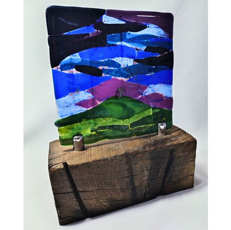 This piece features a fused glass picture depicting an evening view of Burrow Hill, also known as One Tree Hill, with a beautiful sky. It is mounted on a chunky piece of hardwood and would look stunning in a window with the light coming through but equally at home on a matlepiece or table. The picture is made using art glass including powders and frit, to create the unique and interesting play of colours and shapes. The piece is then fired to over 800 degrees celcius, fusing together all the pieces into one solid picture.