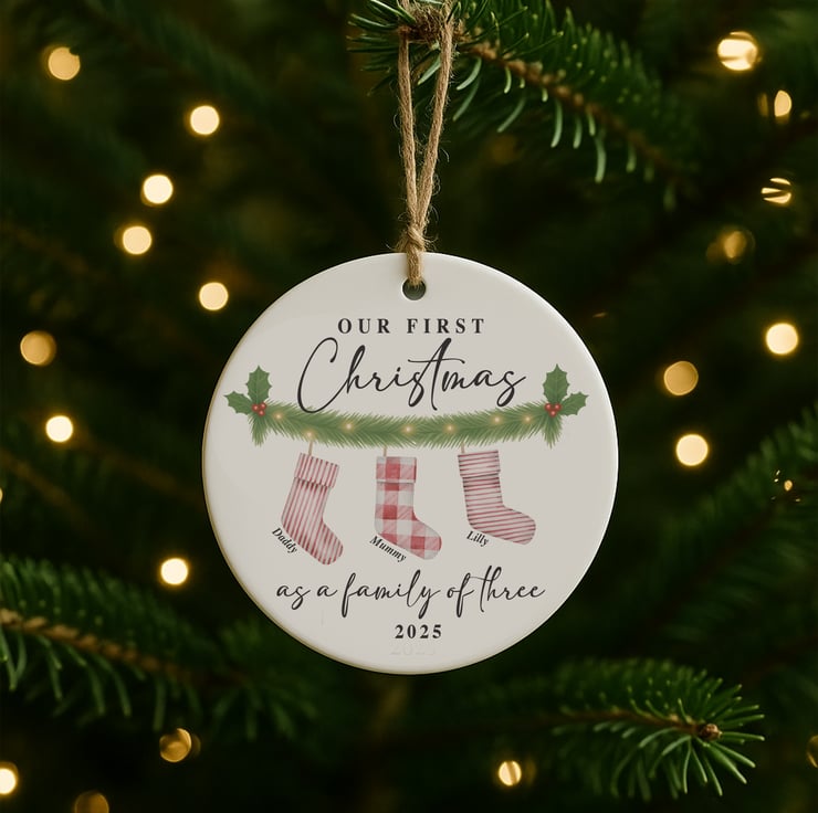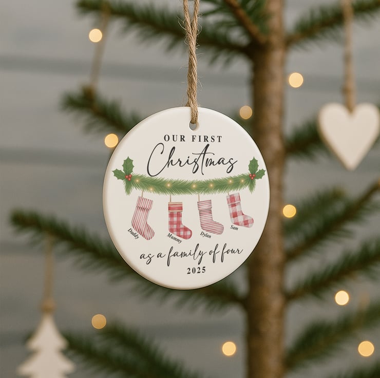 Celebrate a milestone festive season with this beautifully crafted personalised “Our First Christmas” bauble, featuring charming hanging stockings with your family’s names beneath. Whether it’s your first Christmas as a new family, newlyweds, or welcoming a new addition, this decoration is a heartwarming way to commemorate the special year you became a family.