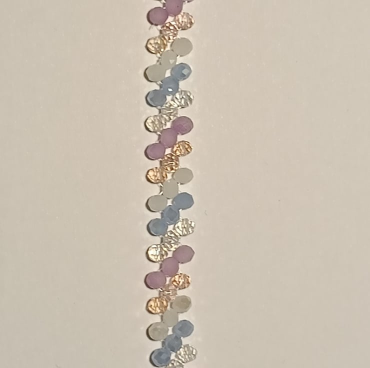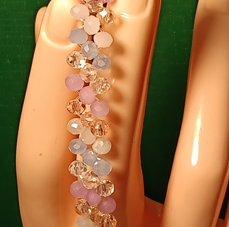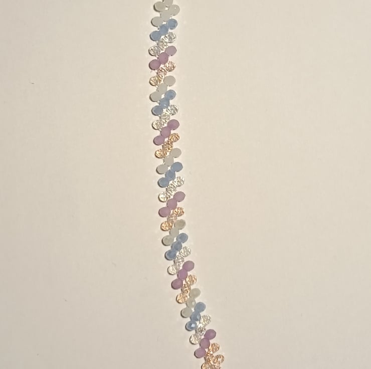 This unique piece is made of 4mm white iridescent crystal beads , 4mm translucent pale blue crystal beads, 4mm clear transparent crystal beads, 4mm lavender crystal beads and 4mm transparent pink crystal beads.