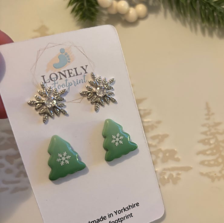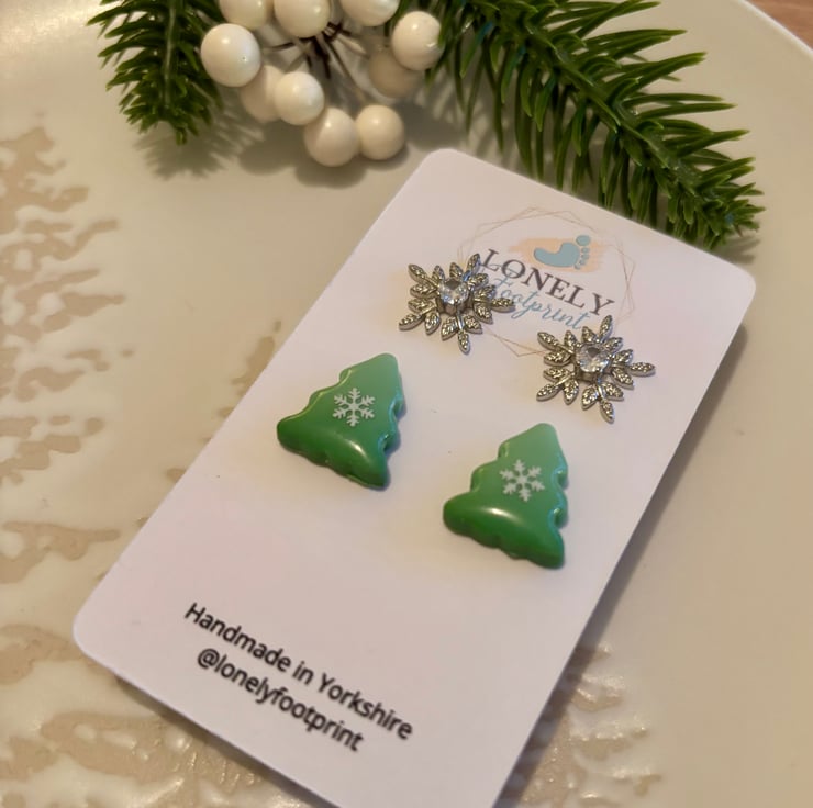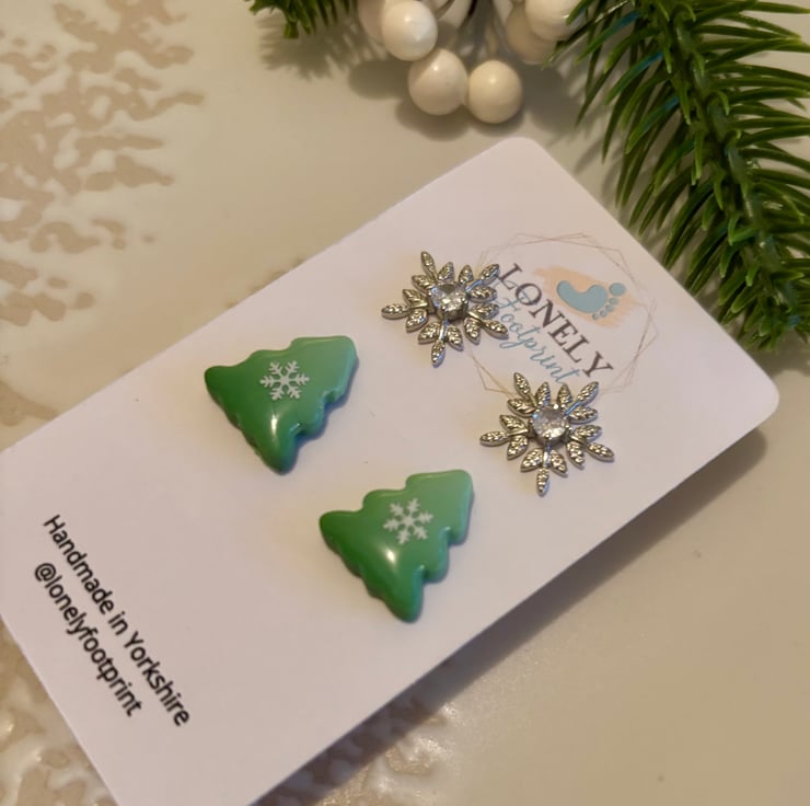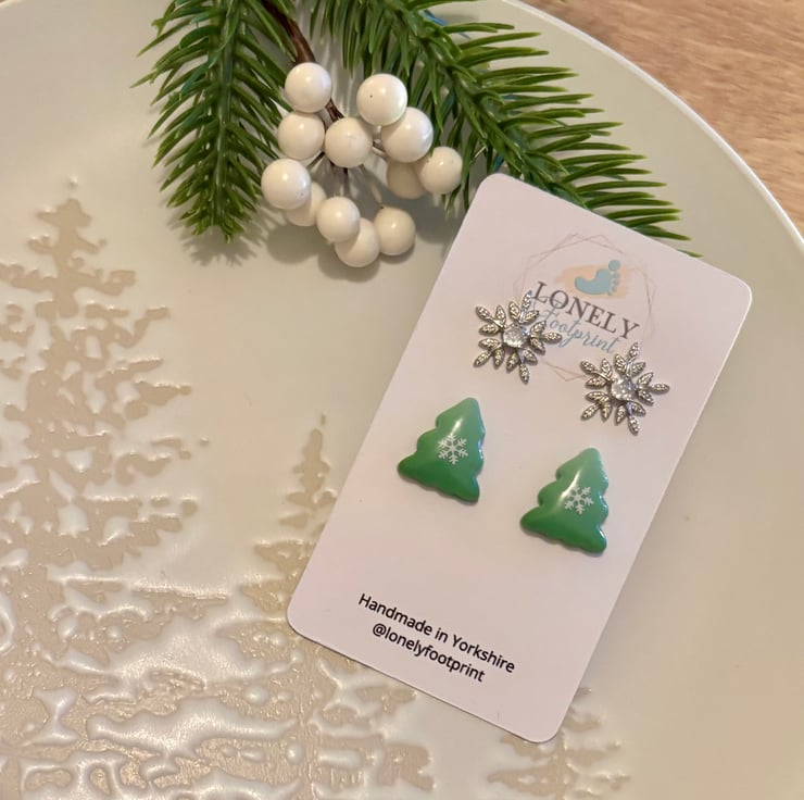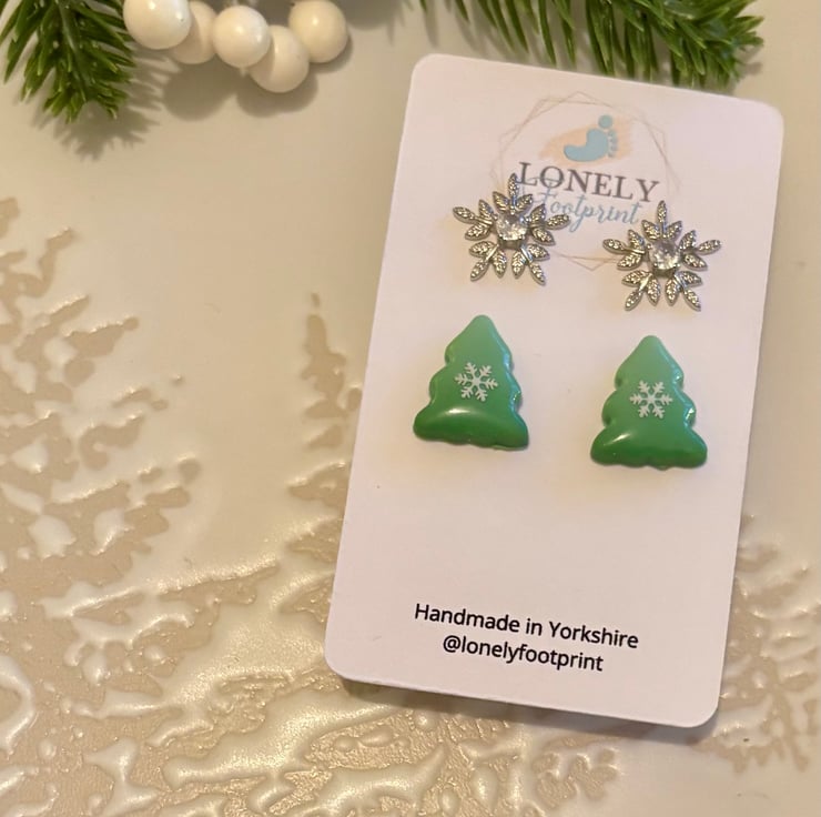 Christmas Tree and Snowflake Studs Polymer Clay Earrings - Handmade Jewellery