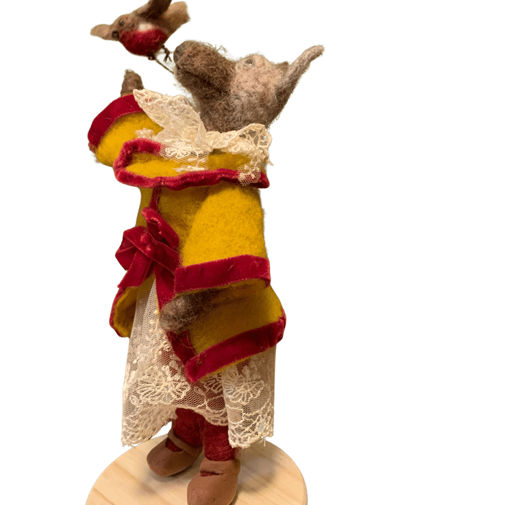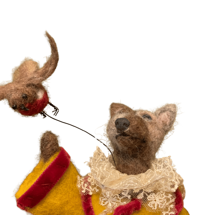 Bunty was inspired by a flash of winter sunshine and those storybook terriers that can’t help but tiptoe after a friendly robin. Her mustard coat and ruby-velvet trims borrow from Victorian party dresses and festive ribbons, while the lace collar nods to vintage postcards. Chirp’s little hover on a fine wire adds the moment of caught-in-flight joy you see in the garden on frosty mornings.