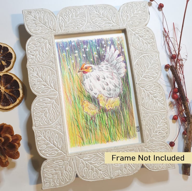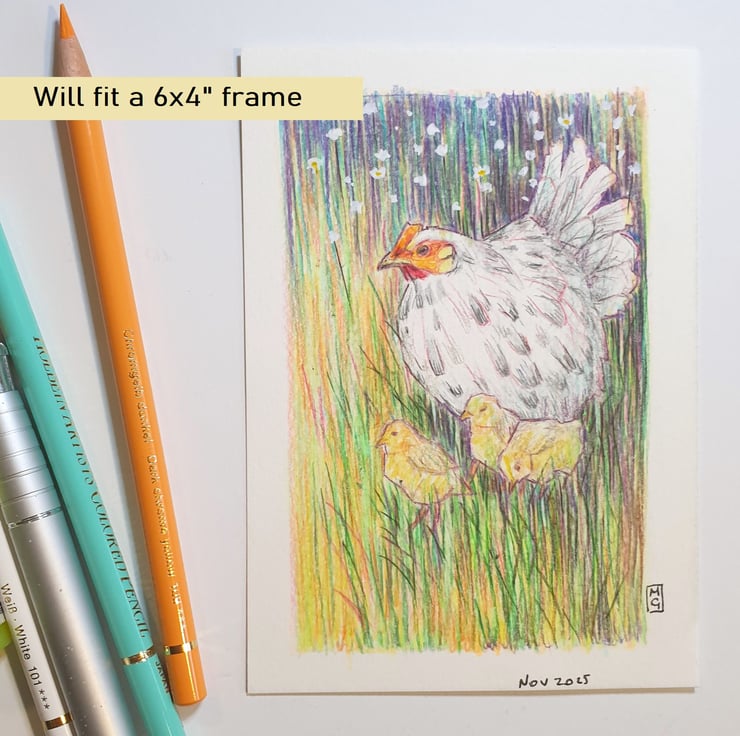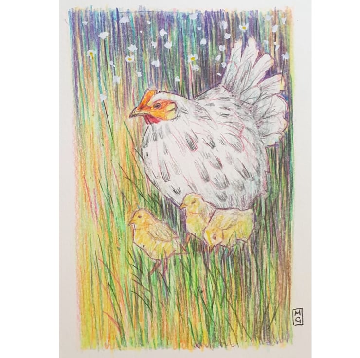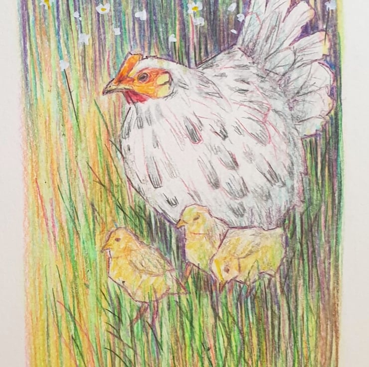 A little drawing in colour pencil of a chicken in a patch of grass with chicks. The drawing is in a soft focus painterly style.