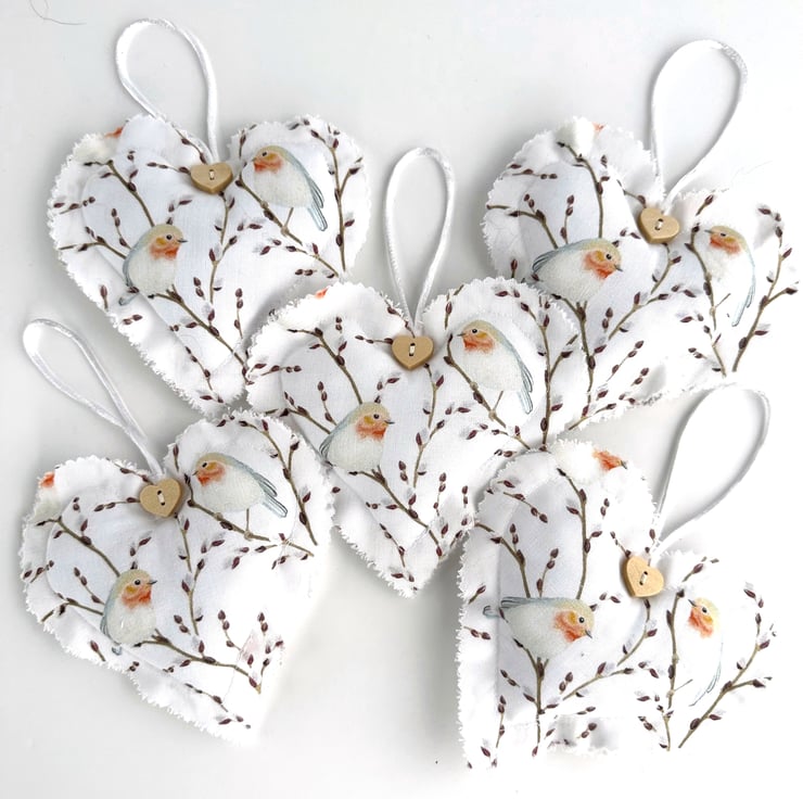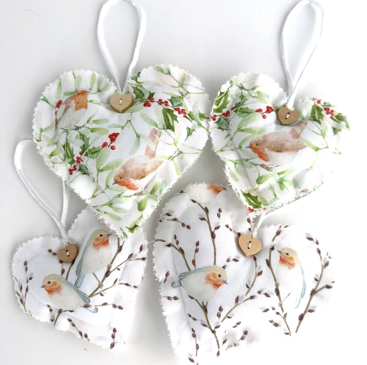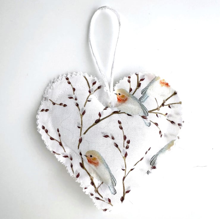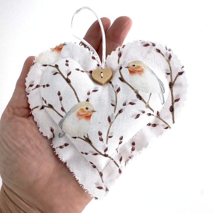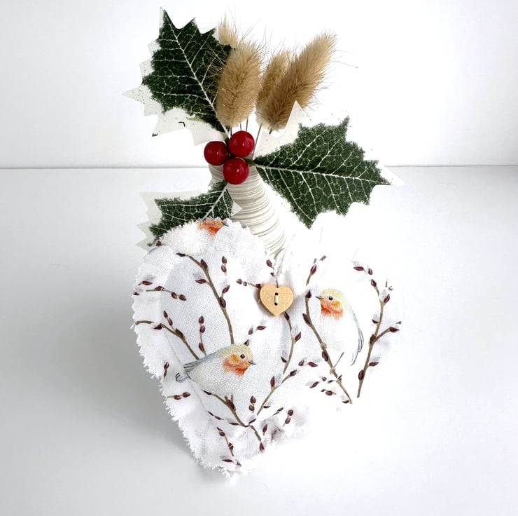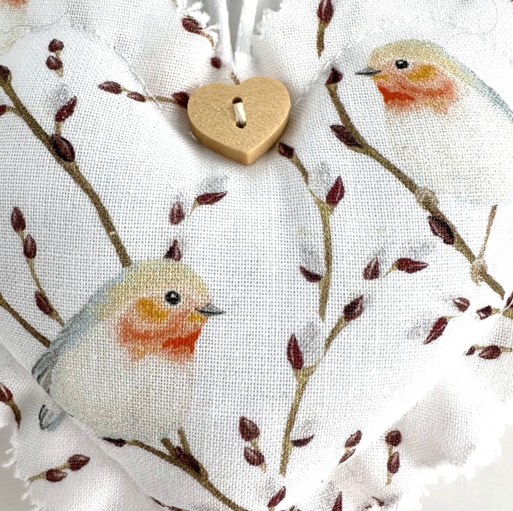 This delightful Christmas heart decoration is made from cotton fabric with a print pattern featuring a pair of robins amongst twigs filled with buds. The pattern is depicted in pastel shades of brown, orange-red, grey and white on a white background. The edges of the heart decoration have been trimmed with pinking shears to give a raw scalloped finish to the heart. I’ve added a natural wood heart shaped button just below the hanging loop. The decoration is lightly padded with polyester hollow fibre filling and has a hanging loop made from white satin cord.
