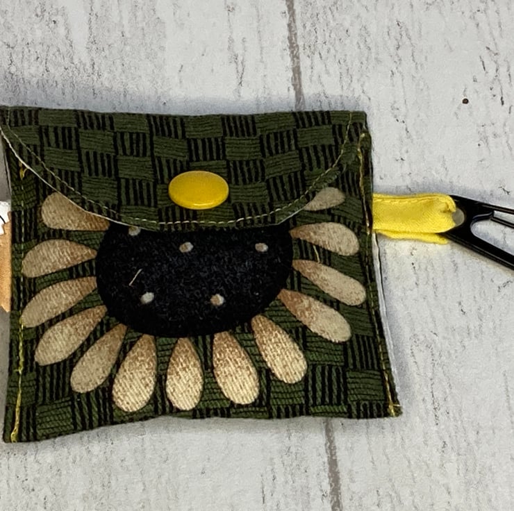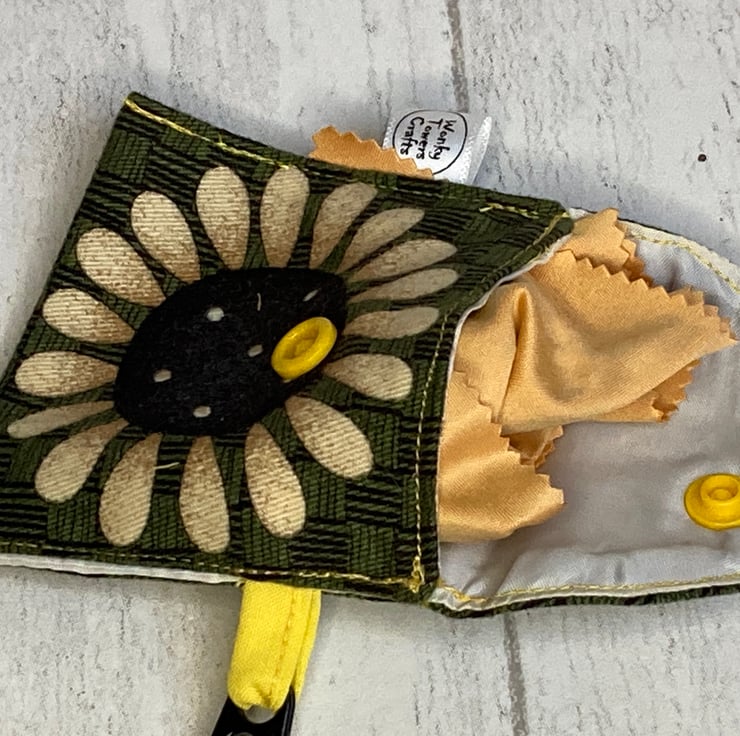 This tiny pouch measures approximately 8 x 8cm and is made from a dark green cotton with a sunflower design. It is secured with a yellow plastic snap. Inside the pouch is lined with grey lining and a large, golden yellow microfibre cloth, measuring 18cm x 16cm is sewn into the seam of the pouch. When you need to clean your lenses, just pull the cloth out, leaving the pouch hanging. When you're done, fold the cloth and pop it back in - the silky lining of the pouch makes this very easy.
