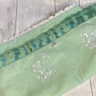 This tiny pouch measures approximately 8 x 8cm and is made from a dark green cotton with a sunflower design. It is secured with a yellow plastic snap. Inside the pouch is lined with grey lining and a large, golden yellow microfibre cloth, measuring 18cm x 16cm is sewn into the seam of the pouch. When you need to clean your lenses, just pull the cloth out, leaving the pouch hanging. When you're done, fold the cloth and pop it back in - the silky lining of the pouch makes this very easy.