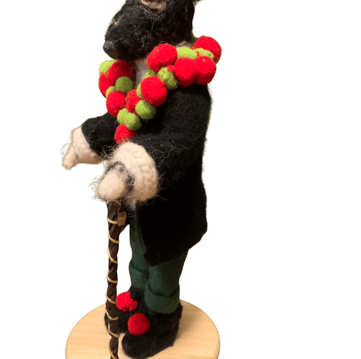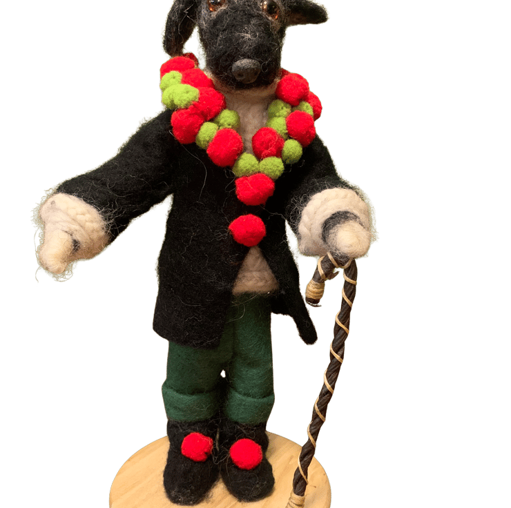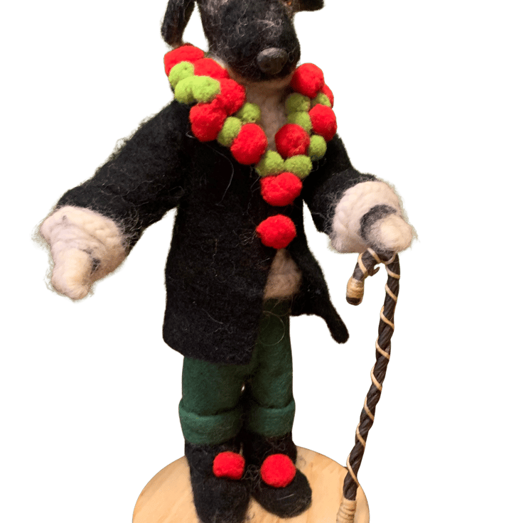 Meet Salty, a sleek little hound with a gentleman’s air. He wears a neat black coat over forest-green trousers, cosy cream jumper and the finest pompoms—berry-red and leaf-green—strung like a celebratory garland. A twined cane completes his promenade look. Hand-sculpted in British wool using traditional needle-felting, Salty stands securely on a smooth wooden base and brings instant storybook charm to any shelf.