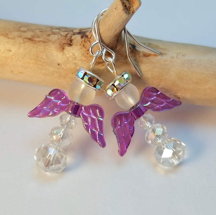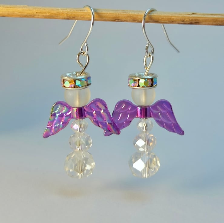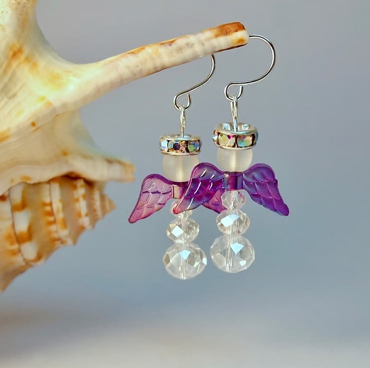 Each of these sparkly Christmas angel earrings features a trio of faceted glass rondelles, a pair of translucent, shimmering purple, acrylic wings, a frosted glass head and a silver halo set with glittering rhinestones.