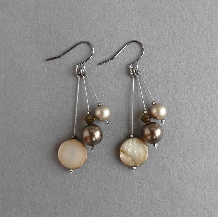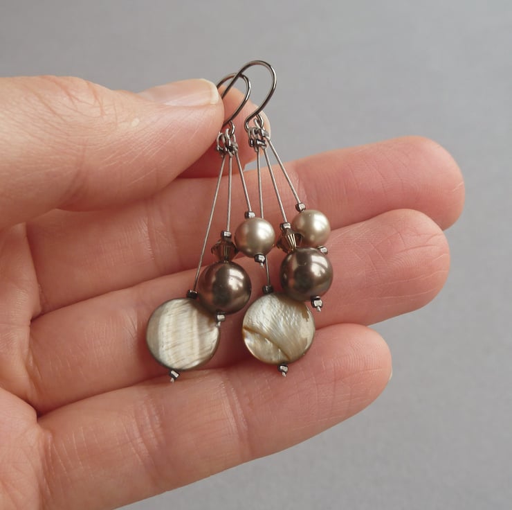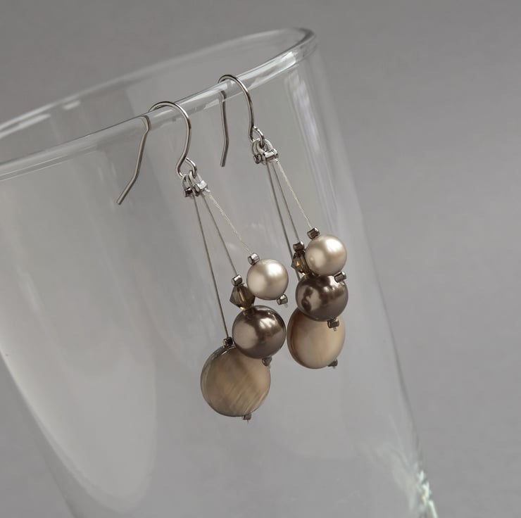 I have used glass pearls, shell and crystal to create these, chocolate three strand earrings. As well as being able to dress up an outfit, these dusty brown drop earrings are also perfect for wearing everyday. As each pair of dangle earrings arrives individually gift wrapped, these dark brown earrings make perfect gifts.
