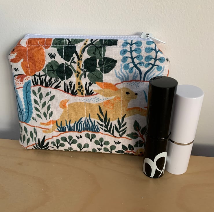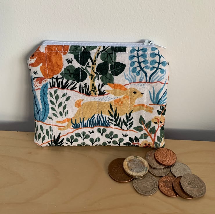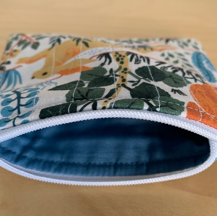 The purse is quilted with white stitching and has a white zip. The purse is fully lined in plain blue cotton fabric.
