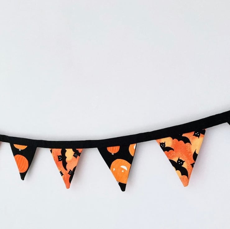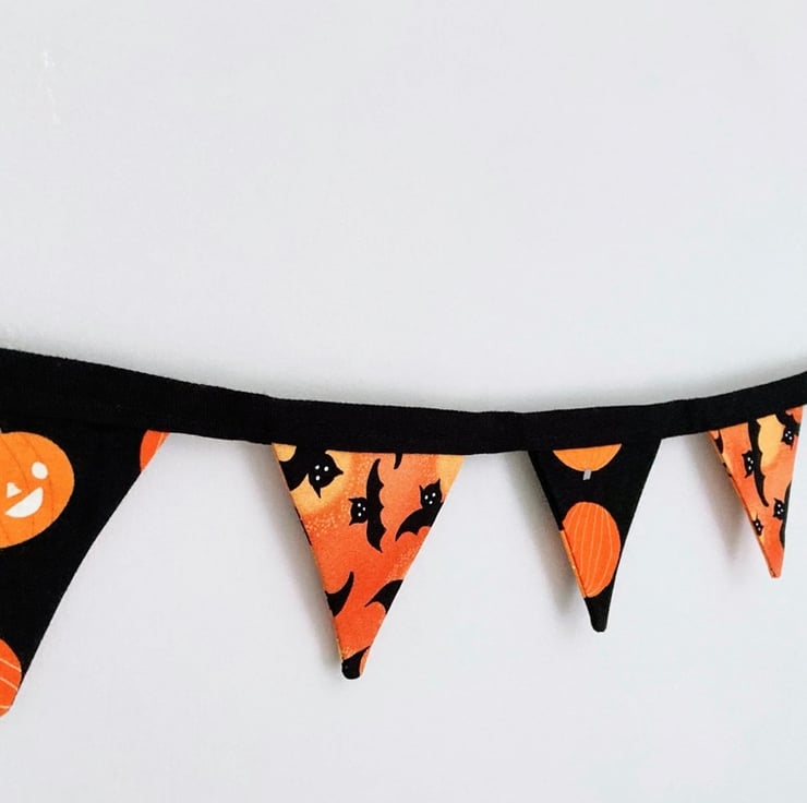 Halloween Mini Bunting: Pumpkins, Bats Cotton Fabric. Black, Orange.