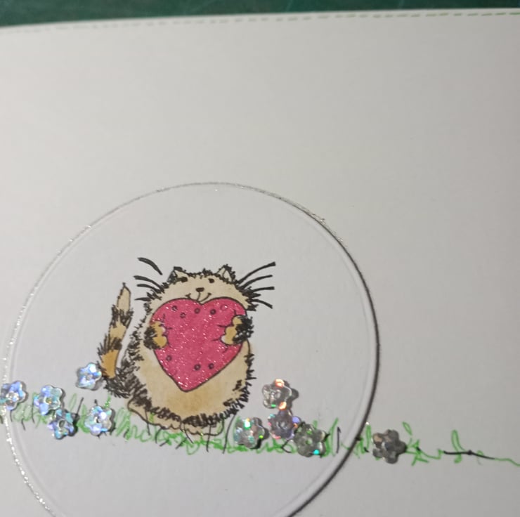 A completely handmade and uniquely designed card. Consisting of pristine white quality card which has the image stamped and hand coloured. Finished off with flower sequins, red ribbon bow and wooden happy birthday.